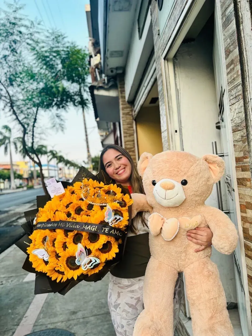 ramo gigante de 40 girasoles con corona metálica, cinta con frase personalizada, mariposas decorativas, peluche de 1.20m