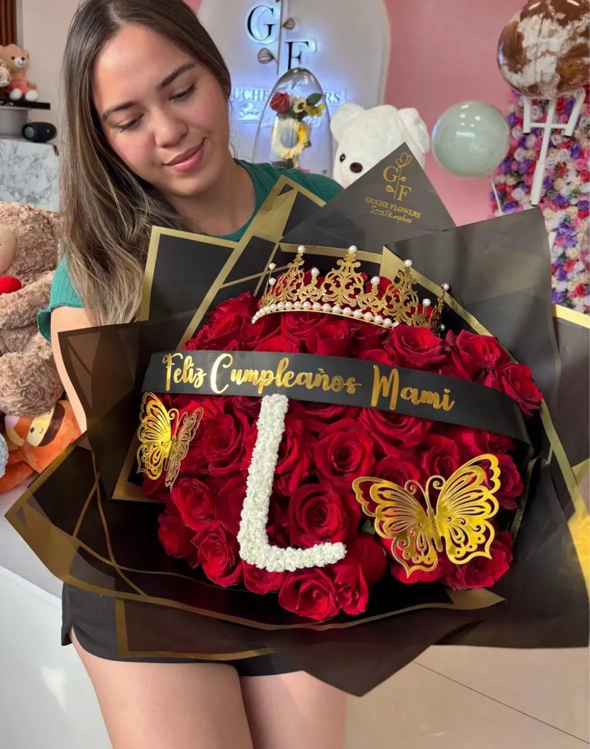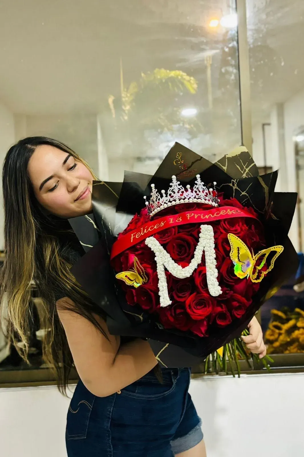 ramo buchón de 50 rosas (color a elegir) corona metálica, frase personalizada, envoltura de papel coreano, lazo y mariposas decorativas. letra personalizada hecha con aliento de bebé.